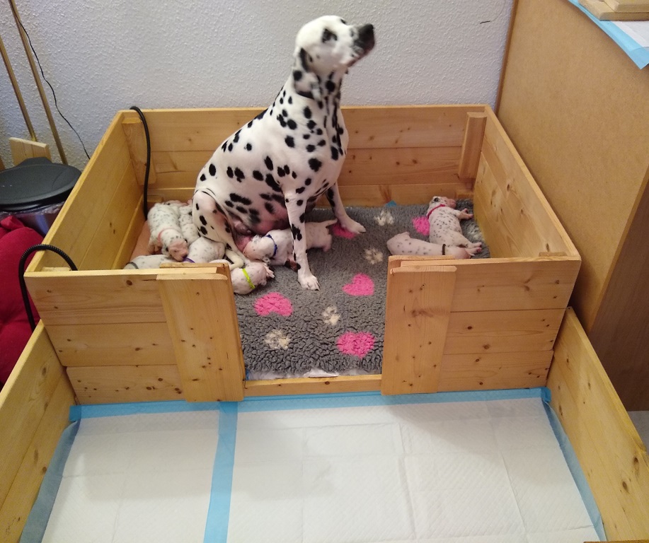 1. Der Pullervorbau. Vor die Wurfkiste wird eine kleine zusätzliche Kiste vorgebaut. Die Welpen lernen schnell, hier ihre Geschäftchen zu erledigen, naja - ein paar Tage dauert es schon, es ist ja auch nicht einfach, erst den Weg nach unten und dann wieder den Weg nach oben zu finden. Im Video zeigt das die Faya mal sehr sehr schön.